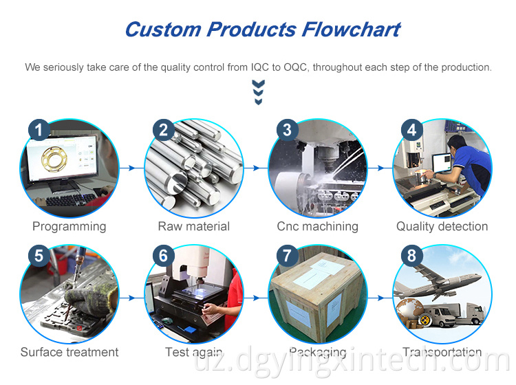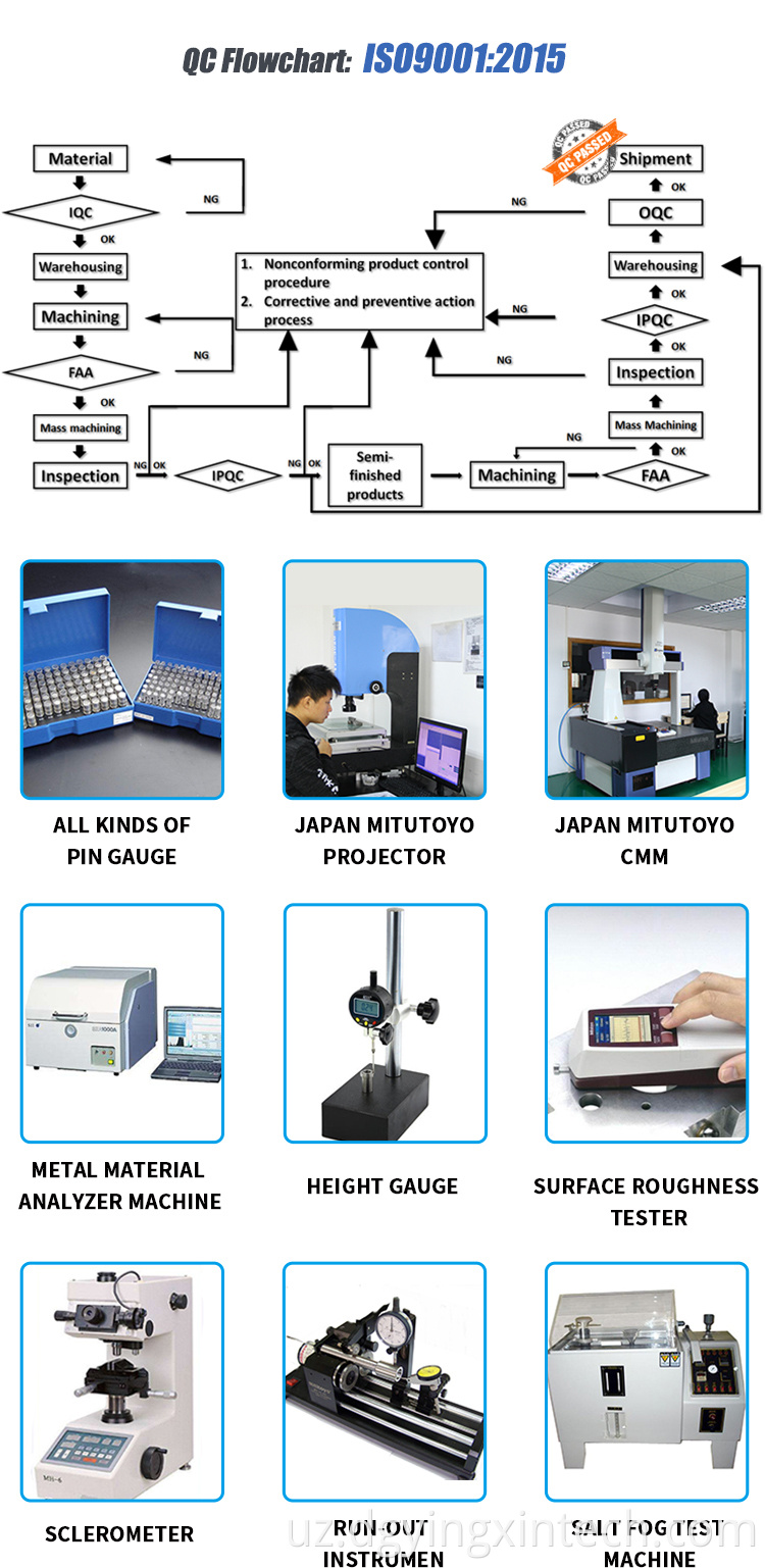 Savol: Siz fabrika yoki savdo kompaniyangizmi? Javob: Yingxin - bu DongGuan Xitoyda joylashgan aniq metall qismlarni qayta ishlash zavodidir. Biz sizni har qanday vaqtga yaqin tashrif buyurish uchun bizni qutlaymiz, biz 3000 dona seminarlar bilan fabrika, 50 texnik xodim bilan : Sizdan nima sotib olasiz? Javob: CNC Ishlov berish qismlari, CNC Ishlab chiqarish xizmati, metall qismlar. Savol: Nega bizdan boshqa etkazib beruvchilardan emas? Javob: 1. 10 yildan ortiq CNC ishlov berish tajribasi. 2. To'liq ishlov berish, sirtni davolash va tekshirish uskunalari. 3. To'g'ri metall qismlar va falokat buyumlarini tayyorlash uchun bitta to'xtatish eritmasini taklif eting. 4. Tikki rangga, rangli gradient rolini, 18k oltin, oynani parlatish, pazanilatishda katta afzalliklarga ega bo'ling. Savol: Buyurtma jarayoni nima? Javob: Batafsil so'rovingizni, shu jumladan 2D / 3D Rasmlaringizni oling, kotirovka va to'lovni amalga oshirish → Kutish uchun → Namunalarni tekshirish → Namunalarni ishlab chiqarish (CNC) Ishlov berish, sirtni davolash) → Videolarni tekshirish (Video) → Yetkazib berish → Yetkazib berish → Qayta tiklash Javob: 2D / 3D chizmalar yoki namunalar kerak, batafsilroq ishlab chiqarish, tezroq ishlab chiqarish. Savol: Men sizning dizaynimizni yashirincha saqlamoqchiman, oshkor etilmagan shartnomaga imzo chekamizmi? A: Albatta, biz NDA-ni imzolashimiz mumkin. Biz hech qachon mijozlarga ma'lumotlarni boshqalarga oshkor qilmaymiz va bizda dasturiy ta'minotning maxfiylik tizimi bor. Savol: Yetkazib berish muddati? Javob: Agar stokda: to'lovdan keyin taxminan 3 kun. Ommaviy ishlab chiqarish: Omonatni olgandan keyin 7 ~ 10 kun o'tgach (aniq etkazib berish muddati muayyan narsalarga bog'liq) Savol: Namuna bepulmi? Javob: Agar sifatni tasdiqlash uchun ishlatilgan bo'lsa, asosiy buyurtmani joylashtirish paytida namunaviy badalni qaytarish mumkin, ammo etkazib berish xarajatlari va soliqlar kiritilmaydi. Sifatni qanday boshqarasiz? (1) Materiallarni tekshirish - material yuzalari va taxminiy o'lchamlarni tekshiring. (2) Mahsulotni birinchi tekshirish - ommaviy ishlab chiqarishning muhim yo'nalishlarini ta'minlash. (3) Namuna olish tekshiruvi - omborga etkazib berishdan oldin sifatni tekshiring. (4) O'zbekistonda inspektsiya - 100% jo'natishdan oldin QK yordamchisiga 100% tekshirish. Savol: Sizning sifatingiz qanday? Javob: Iltimos, paketlarni olgandan so'ng, tovarlarni tekshiring. Noto'g'ri mahsulotlarni topsangiz, avval biz bilan bog'laning, rasmlar yoki videolarni to'plang va bizga ularni yuboring. Muammo qayerdaligini tekshiramiz. Agar sifatli kafolatlar oralig'ida kamchiliklar bo'lsa, biz sizga almashtiramiz. Agar siz CNC ishlov berish qismlariga qiziqsangiz, iltimos, bizga ergashing , biz sizga xizmat qilamiz!